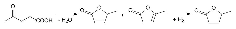 GVL is produced from levulinic acid, which is obtained from hexoses. In a typical process, cellulosic biomasses, such as corn stover, sawgrass, or wood, is hydrolysed into glucose and other sugars using acid catalysts. The resulting glucose can then be dehydrated via hydroxymethylfurfural to yield formic acid and levulinic acid, which cyclises to intermediate unsaturated ring compounds, which can then be hydrogenated to gamma-valerolactone, which has potential applications as a liquid fuel.[6]