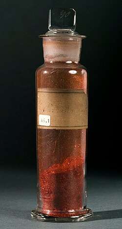 Madder root has been used for dying cloth at least since 1500 BC.[2] Purpurin and alizarin were isolated from the root by Pierre Robiquet and Colin, two French chemists, in 1826. They were identified as anthracene derivatives by Gräbe and Liebermann in 1868. They also synthesized alizarin from bromoanthraquinone, which, together with the conversion of alizarin into purpurin published previously by M. F. De Lalande, provided the first synthetic route to purpurin.[3] The positions of the OH groups were determined by Bayer and Caro in 1874–1875.[4]