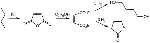 In one industrial chemical synthesis, acetylene reacts with two equivalents of formaldehyde to form butyne-1,4-diol. Hydrogenation of butyne-1,4-diol gives butane-1,4-diol.[9] It is also made on an industrial scale from maleic anhydride in the Davy process, which is first converted to the methyl maleate ester, then hydrogenated. Other routes are from butadiene, allyl acetate and succinic acid.