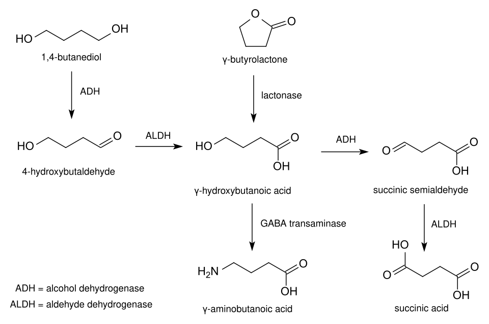 Butane-1,4-diol is rapidly converted into GHB acid by the enzymes alcohol dehydrogenase and aldehyde dehydrogenase, and differing levels of these enzymes may account for differences in effects and side effects between users.[19] While co-administration of ethanol and GHB already poses serious risks, co-administration of ethanol with 1,4-butanediol will interact considerably and has many other potential risks. This is because the same enzymes that are responsible for metabolizing alcohol also metabolize 1,4-butanediol so there is a strong chance of a dangerous drug interaction.[19][20] Emergency room patients who overdose on both ethanol and 1,4-butanediol often present with symptoms of alcohol intoxication initially and as the ethanol is metabolized the 1,4-butanediol is then able to better compete for the enzyme and a second period of intoxication ensues as the 1,4-butanediol is converted into GHB.[19]