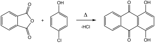Quinizarin is produced by the reaction of phthalic anhydride and 4-chlorophenol followed by hydrolysis of the chloride:[2][3]