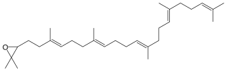 (S)-2,3-Oxidosqualene ((S)-2,3-epoxysqualene) is an intermediate in the synthesis of the cell membrane sterol precursors lanosterol and cycloartenol, as well as saponins. It is formed when squalene is oxidized by the enzyme squalene monooxygenase. 2,3-Oxidosqualene is the substrate of various oxidosqualene cyclases, including lanosterol synthase, which produces lanosterol, a precursor to cholesterol.[1]
