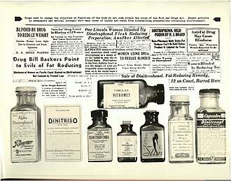 - ^ a b c Swann, John P. (2010). "Reducing with dinitrophenol : self-medication, and the challenge of regulating a dangerous pharmaceutical before the US Food, Drug, and Cosmetic Act". Perspectives on Twentieth-century Pharmaceuticals. Peter Lang. pp. 289, 292, 299, 301. ISBN 978-3-03910-920-3.