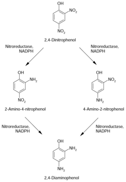 Information about pharmacokinetics and pharmacodynamics of DNP in humans is limited.[29] DNP is metabolized via nitro reduction. Its major metabolites are 2-Amino-4-nitrophenol and 4-amino-2-nitrophenol. In overdoses, symptom onset can be as soon as 3 hours and the average time to death was 14 hours.[22][23]