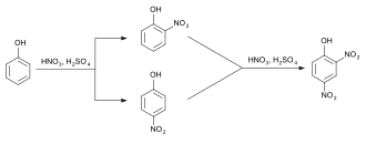 DNP can be produced by hydrolysis of 2,4-dinitrochlorobenzene.[5][11] Other routes of DNP synthesis include nitration of monochlorobenzene, nitration of benzene with nitrogen dioxide and mercurous nitrate, oxidation of 1,3-dinitrobenzene, and nitration of phenol with nitric acid.[12][13] Nitration of phenol is not practical commercially because partial decomposition of the phenolic ring occurs.[3]
