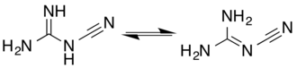 10. ^ Alı́a, J.M.; Edwards, H.G.M.; Garcı́a Navarro, F.J. (2001). "The imino–amino tautomeric equilibrium in cyanoguanidine dissolved in several aprotic solvents; an FT-Raman spectroscopic study". Journal of Molecular Structure. 597 (1–3): 49–55. Bibcode:2001JMoSt.597...49A. doi:10.1016/S0022-2860(01)00579-8.