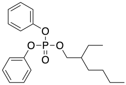 2-Ethylhexyl diphenyl phosphate (Octicizer) is an organophosphate compound. It acts as both a plasticizer and flame retardant in PVC, its wide liquid range also makes it suitable as a flame retardant in hydraulic fluids. It has low acute toxicity in feeding experiments,[1] but has been implicated as a potential hormone mimetic.[2][3]