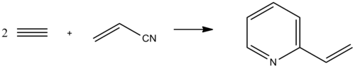 An alternative synthesis involves the reaction of acrylonitrile and acetylene below 130–140 ̊C in the presence of organocobalt compounds as a catalyst.[2] Acrylonitrile is the solvent for the reaction.[3]