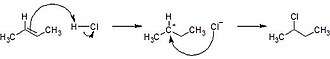 The reaction is two-step, with the pi electrons attacking the chloride hydrogen, which forms a chloride nucleophile. In the second step, the nucleophile attacks the carbocation generated in the first step.