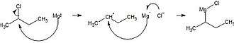 As an alkyl halide, 2-chlorobutane can be used to prepare a Grignard reagent for use in forming a carbon-carbon bond.[4] In the first step, a magnesium ion donates an electron to the alpha carbon in 2-chlorobutane, removing chlorine and forming an allyl radical as well as a magnesium radical. In the second step, the magnesium radical couples with the allyl radical while the chloride ion interacts with the magnesium ion.