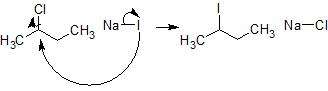 In an SN2 reaction, a nucleophile (iodine) attacks the partially positive carbon, which eliminates the chlorine. This occurs in one step.