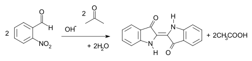 2-Nitrobenzaldehyde is an intermediate in an early route to indigo, a water-insoluble dye commonly used to dye jeans and other fabrics. In the Baeyer–Drewson indigo synthesis, 2-nitrobenzaldehyde condenses with acetone in basic aqueous solution to yield indigo in a one-pot synthesis[9][10] The method was abandoned in the early part of the 20th century, being replaced by routes from aniline.[11]
