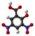 3,5-Dinitrosalicylic acid (DNS or DNSA, IUPAC name 2-hydroxy-3,5-dinitrobenzoic acid) is an aromatic compound that reacts with reducing sugars and other reducing molecules to form 3-amino-5-nitrosalicylic acid, which strongly absorbs light at 540 nm. It was first introduced as a method to detect reducing substances in urine by James B. Sumner[2] and has since been widely used, for example, for quantifying carbohydrate levels in blood.[3] It is mainly used in assay of alpha-amylase. However, enzymatic methods are usually preferred due to DNS's lack of specificity.[4]