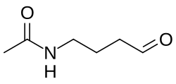 4-Acetamidobutanal, also known as N-acetyl-γ-aminobutyraldehyde, N-acetyl-GABAL, or N-acetyl-GABA aldehyde, is a metabolic intermediate in the biosynthesis of γ-aminobutyric acid (GABA) from putrescine.[1][2][3][4] Other intermediates in this pathway include N-acetylputrescine and N-acetyl-γ-aminobutyric acid (N-acetyl-GABA).[2][3][4] Enzymes mediating the transformations in this pathway include putrescine acetyltransferase (PAT), monoamine oxidase B (MAO-B), aldehyde dehydrogenase (ALDH), and an unknown deacetylase enzyme.[2][3][4] The pathway is a minor pathway in GABA synthesis compared to the main pathway in which GABA is synthesized from glutamate.[2][3][4] However, the pathway has been found to have an important physiological role in the brain, for instance in the production of GABA in the striatum and resultant inhibition of dopaminergic neurons in this brain area.[1][4]