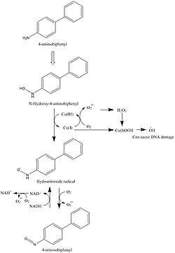 4-Aminobiphenyl causes DNA damage, which is thought to be mediated by formation of DNA adducts. In this process, 4-aminobiphenyl is oxidized in the liver giving the N-hydroxy derivative (4-aminobiphenyl-(NHOH)) by a cytochrome P450 isozyme. The final products of this metabolism are aryl nitrenium ions which form DNA adducts.[10] During this process reactive oxygen species might also be produced and lead to oxidative DNA damage which might also play a role in the carcinogenesis. (N-hydroxy derivative causes oxidative DNA damage dramatically enhanced by NADH which leads to oxidation of 4-aminobiphenyl to a hydronitroxide radical).[10] A linear correlation was found between adduct levels and the occurrence of liver tumors in female mice by comparing DNA adducts and tumorigenesis.