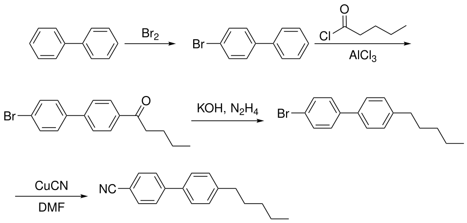 5CB is produced by modifying biphenyl in a linear manner. First Br2 is added to the biphenyl to introduce a bromine atom to the end of the moiety. Next aluminium chloride and C4H9COCl is added to the sample, followed by the addition of potassium hydroxide and NH2NH2. By this point the molecule will have a bromine atom on one end of the rigid core and C5H11 on the other end. Finally, introduction of copper(I) cyanide and DMF results in the removal of the bromine and its replacement with CN, yielding 5CB.[3]