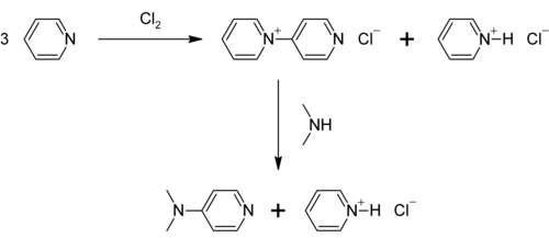 DMAP can be prepared in a two-step procedure from pyridine, which is first oxidized to 4-pyridylpyridinium cation. This cation then reacts with dimethylamine:[7]