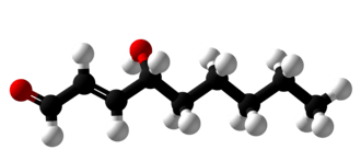 4-Hydroxynonenal, or 4-hydroxy-2E-nonenal or 4-hydroxy-2-nonenal or 4-HNE or HNE, (C9H16O2), is an α,β-unsaturated hydroxyalkenal that is produced by lipid peroxidation in cells. 4-HNE is the primary α,β-unsaturated hydroxyalkenal formed in this process. It is a colorless oil. It is found throughout animal tissues, and in higher quantities during oxidative stress due to the increase in the lipid peroxidation chain reaction, due to the increase in stress events. 4-HNE has been hypothesized to play a key role in cell signal transduction, in a variety of pathways from cell cycle events to cellular adhesion.[2]