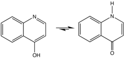 The chemical synthesis of quinolones often involves ring-closing reactions.[2] Such reactions often install a hydroxyl group (an –OH functional group) on the carbon across from the ring nitrogen (i.e., the C-4 positions). An example of such a synthesis is the Camps cyclization, which, depending on starting materials and reaction conditions, can give both 2-hydroxyquinolines (B) and 4-hydroxyquinolines (A) as shown. The hydroxyquinolines tautomerize to the quinolones.
