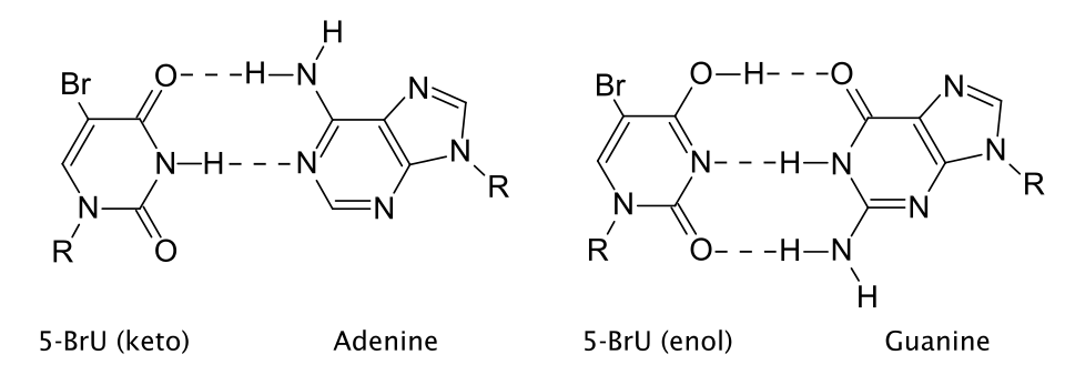 5-BrU exists in three tautomeric forms that have different base pairing properties. The keto form (shown in the infobox) is complementary to adenine, so it can be incorporated into DNA by aligning opposite adenine residues during DNA replication (see below left). Alternatively, the enol (below right) and ion forms are complementary to guanine. This means that 5-BrU can be present in DNA either opposite adenine or guanine.