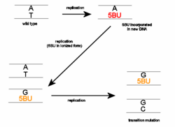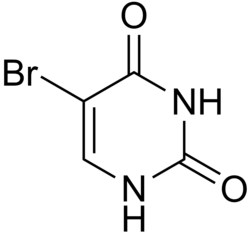 5-Bromouracil (5-BrU, 5BrUra, or br5Ura[1]) is a brominated derivative of uracil that acts as an antimetabolite or base analog, substituting for thymine in DNA, and can induce DNA mutation in the same way as 2-aminopurine.[2] It is used mainly as an experimental mutagen, but its deoxyriboside derivative (5-bromo-2-deoxy-uridine) is used to treat neoplasms.