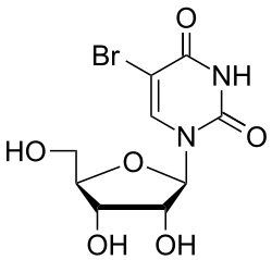 5-Bromouridine (abbreviated BrUrd, 5BrU, br5Urd or rarely the one letter code B)[2] is a uridine derivative with a bromo substituent at the fifth carbon.[3] BrUrd is incorporated into RNA and can be detected immunocytochemically and analysed by cytometry. It causes DNA damage through base substitution and increases the number of mutations.[4]