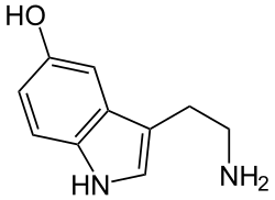 5-HTP is decarboxylated to serotonin (5-hydroxytryptamine or 5-HT) by the enzyme aromatic-L-amino-acid decarboxylase with the help of vitamin B6.[2] This reaction occurs both in nervous tissue and in the liver.[3] 5-HTP crosses the blood–brain barrier,[4] while 5-HT does not. Excess 5-HTP, especially when administered with vitamin B6, is thought to be metabolized and excreted.[5][6]
