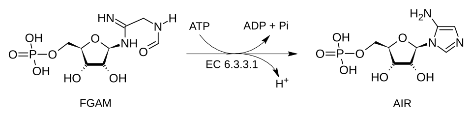 - FGAM + ATP → AIR + ADP + Pi + H+