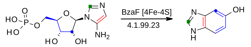 In some anaerobes, AIR is a precursor to 5,6-dimethylbenzimidazole, which is incorporated into vitamin B12 in later steps of cobalamin biosynthesis.[5][18] The initial reaction is catalysed by 5-hydroxybenzimidazole synthase, EC 4.1.99.23, and forms 5-hydroxybenzimidazole: