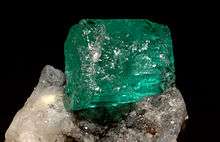 Emerald is a rare and valuable gemstone and, as such, it has provided the incentive for developing synthetic emeralds. Both hydrothermal[25] and flux-growth synthetics have been produced. The first commercially successful emerald synthesis process was that of Carroll Chatham.[26] The other large producer of flux emeralds was Pierre Gilson Sr., which has been on the market since 1964. Gilson's emeralds are usually grown on natural colorless beryl seeds which become coated on both sides. Growth occurs at the rate of 1 millimetre (0.039 in) per month, a typical seven-month growth run producing emerald crystals of 7 mm of thickness.[27] The green color of emeralds is widely attributed to presence of Cr3+ ions.[16][17][18] Intensely green beryls from Brazil, Zimbabwe and elsewhere in which the color is attributed to vanadium have also been sold and certified as emeralds.[28][29][30]