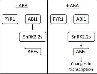 In the absence of ABA, the phosphatase ABA-INSENSITIVE1 (ABI1) inhibits the action of SNF1-related protein kinases (subfamily 2) (SnRK2s). ABA is perceived by the PYRABACTIN RESISTANCE 1 (PYR1) and PYR1-like membrane proteins. On ABA binding, PYR1 binds to and inhibits ABI1. When SnRK2s are released from inhibition, they activate several transcription factors from the ABA RESPONSIVE ELEMENT-BINDING FACTOR (ABF) family. ABFs then go on to cause changes in the expression of a large number of genes.[7] Around 10% of plant genes are thought to be regulated by ABA.