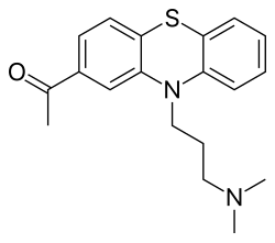 Acepromazine, acetopromazine, or acetylpromazine (commonly known as ACP, Ace, or by the trade names Atravet or Acezine 2, number depending on mg/ml dose) is a phenothiazine derivative antipsychotic drug. It was used in humans during the 1950s as an antipsychotic,[4] but is now almost exclusively used on animals as a sedative and antiemetic. A closely related analogue, chlorpromazine, is still used in humans.