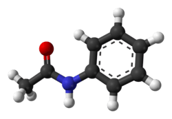Acetanilide was the first aniline derivative found to possess analgesic as well as antipyretic properties, and was quickly introduced into medical practice under the names of Antifebrin by A. Cahn and P. Hepp in 1886.[11] But its (apparent) unacceptable toxic effects, the most alarming being cyanosis due to methemoglobinemia and ultimately liver and kidney damage,[15] prompted the search for supposedly less toxic aniline derivatives such as phenacetin.[16] After several conflicting results over the ensuing fifty years, it was established in 1948 that acetanilide was mostly metabolized to paracetamol (acetaminophen) in the human body, and that it was this metabolite that was responsible for the analgesic and antipyretic properties.[17][12][18][11] The observed methemoglobinemia after acetanilide administration was ascribed to the small proportion of acetanilide that is hydrolyzed to aniline in the body.