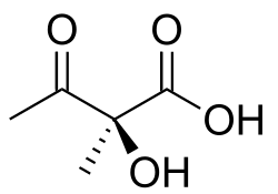 α-Acetolactic acid is a precursor in the biosynthesis of the branched chain amino acids valine and leucine. α-Acetolactic acid is produced from two molecules of pyruvic acid by acetolactate synthase. α-Acetolactic acid can also be decarboxylated by alpha-acetolactate decarboxylase to produce acetoin.[1][2] The name α-acetolactate is used for anion (conjugate base), salts, and esters of α-acetolactic acid.