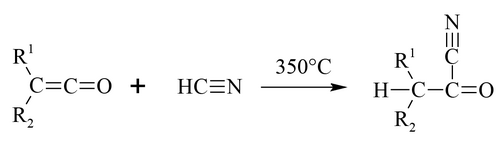 Acetyl cyanide is prepared from acetyl chloride and cyanide sources, often in the presence of copper catalysts.[2] Acetyl cyanide is also synthesized at 350 °C from ketene and hydrogen cyanide.[4]