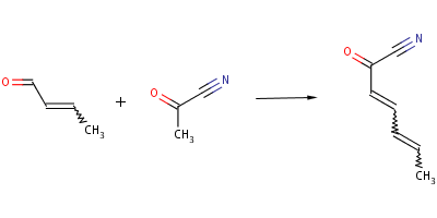 Two main types of reactions can occur with acetyl cyanide as a reactant; aldol condensation and enolate substitution. Aldol condensation can occur when acetyl cyanide reacts with (Z)-but-2-enal to form (2E,4E)-hexa-2,4-dienoyl cyanide: