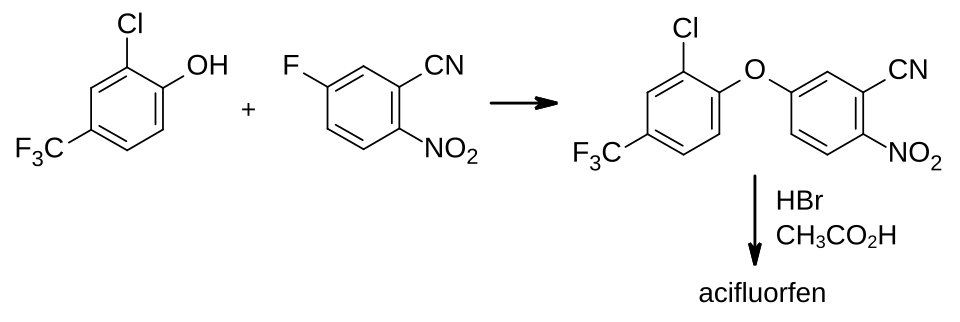 The preparation of acifluorfen first described in the Rohm & Haas patent includes as its final steps an Ullmann condensation between 2-chloro-4-trifluoromethylphenol and 2-nitro-5-fluorobenzonitrile. The intermediate is then hydrolysed using hydrobromic acid in acetic acid as solvent.[9]