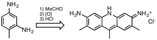 At one time acridine dyes were commercially significant, but they are now uncommon because they are not lightfast. Acridine dyes are prepared by condensation of 1,3-diaminobenzene derivatives. Illustrative is the reaction of 2,4-diaminotoluene with acetaldehyde:[13]