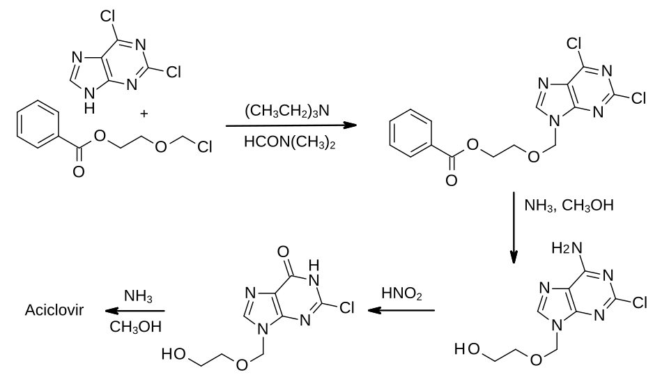In the first step shown, 2,6-dichloropurine was alkylated with 1-benzoyloxy-2-chloromethoxyethane. The chlorine group at the 6-position of the heterocyclic ring is more reactive than the chlorine at the 2-position, hence it can be selectively replaced by an amino group, which was then converted to an amide using nitrous acid. Finally, the remaining chlorine was replaced by the amino group of aciclovir using ammonia in methanol.[51] This synthesis and other methods for preparing the compound have been reviewed.[52]