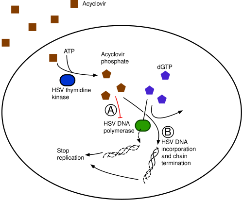 Aciclovir is converted by viral thymidine kinase to aciclovir monophosphate, which is then converted by host cell kinases to aciclovir triphosphate (ACV-TP, also known as aciclo-GTP).[27] ACV-TP is a very potent inhibitor of viral DNA replication. ACV-TP competitively inhibits and inactivates the viral DNA polymerase.[41] Its monophosphate form also incorporates into the viral DNA, resulting in chain termination.[27][42][43]