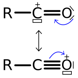 Acylium ions are cations of the formula RCO+.[4] The carbon–oxygen bond length in these cations is near 1.1 Å (110-112 pm), which is shorter than the 112.8 pm of carbon monoxide and indicates triple-bond character.[5][6][7]