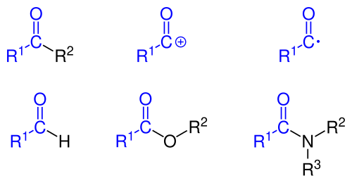 In chemistry, an acyl group is a moiety derived by the removal of one or more hydroxyl groups from an oxoacid,[1] including inorganic acids. It contains a double-bonded oxygen atom and an organyl group (R−C=O) or hydrogen in the case of formyl group (H−C=O). In organic chemistry, the acyl group (IUPAC name alkanoyl if the organyl group is alkyl) is usually derived from a carboxylic acid, in which case it has the formula R−C(=O)−, where R represents an organyl group or hydrogen. Although the term is almost always applied to organic compounds, acyl groups can in principle be derived from other types of acids such as sulfonic acids and phosphonic acids. In the most common arrangement, acyl groups are attached to a larger molecular fragment, in which case the carbon and oxygen atoms are linked by a double bond.