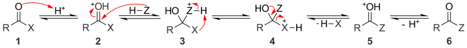 Under acidic conditions, the carbonyl group of the acyl compound 1 is protonated, which activates it towards nucleophilic attack. In the second step, the protonated carbonyl 2 is attacked by a nucleophile (H−Z) to give tetrahedral intermediate 3. Proton transfer from the nucleophile (Z) to the leaving group (X) gives 4, which then collapses to eject the protonated leaving group (H−X), giving protonated carbonyl compound 5. The loss of a proton gives the substitution product, 6. Because the last step involves the loss of a proton, nucleophilic acyl substitution reactions are considered catalytic in acid. Also note that under acidic conditions, a nucleophile will typically exist in its protonated form (i.e. H−Z instead of Z−).