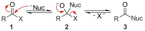 Acyl compounds react with nucleophiles via an addition mechanism: the nucleophile attacks the carbonyl carbon, forming a tetrahedral intermediate. This reaction can be accelerated by acidic conditions, which make the carbonyl more electrophilic, or basic conditions, which provide a more anionic and therefore more reactive nucleophile. The tetrahedral intermediate itself can be an alcohol or alkoxide, depending on the pH of the reaction.