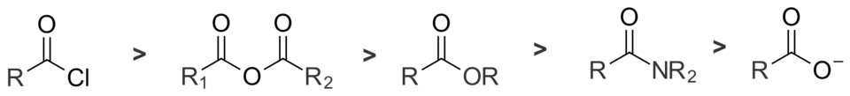 There are five main types of acyl derivatives. Acid halides are the most reactive towards nucleophiles, followed by anhydrides, esters, and amides. Carboxylate ions are essentially unreactive towards nucleophilic substitution, since they possess no leaving group. The reactivity of these five classes of compounds covers a broad range; the relative reaction rates of acid chlorides and amides differ by a factor of 1013.[2]
