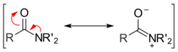 Another factor that plays a role in determining the reactivity of acyl compounds is resonance. Amides exhibit two main resonance forms. Both are major contributors to the overall structure, so much so that the amide bond between the carbonyl carbon and the amide nitrogen has significant double bond character. The energy barrier for rotation about an amide bond is 75–85 kJ/mol (18–20 kcal/mol), much larger than values observed for normal single bonds. For example, the C–C bond in ethane has an energy barrier of only 12 kJ/mol (3 kcal/mol).[2] Once a nucleophile attacks and a tetrahedral intermediate is formed, the energetically favorable resonance effect is lost. This helps explain why amides are one of the least reactive acyl derivatives.[3]