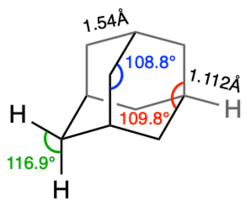 As deduced by electron diffraction and X-ray crystallography, the molecule has Td symmetry. The carbon–carbon bond lengths are 1.54 Å, almost identical to that of diamond. The carbon–hydrogen distances are 1.112 Å.[3]