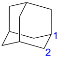 The nuclear magnetic resonance (NMR) spectrum of adamantane consists of two poorly resolved signals, which correspond to sites 1 and 2 (see picture below). The 1H and 13C NMR chemical shifts are respectively 1.873 and 1.756 ppm and are 28.46 and 37.85 ppm.[29] The simplicity of these spectra is consistent with high molecular symmetry.