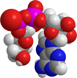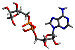 Adenosine diphosphate ribose (ADPR) is an ester molecule formed into chains by the enzyme poly ADP ribose polymerase.[1] ADPR is created from cyclic ADP-ribose (cADPR) by the CD38 enzyme using nicotinamide adenine dinucleotide (NAD+) as a cofactor.[1]