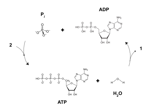 The conversion of ATP to ADP is the principal mechanism for energy supply in biological processes.[5] Energy is produced in cells when the terminal phosphate group in an ATP molecule is removed from the chain to produce adenosine diphosphate (ADP) when water hydrolyzes ATP:[5]